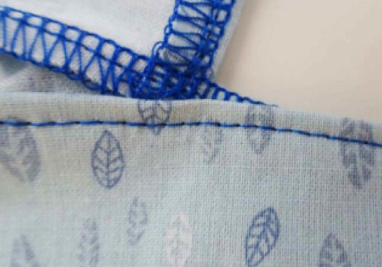Fold overlock-sømmen indad tæt på kanten og sy med symaskinen. Start sømmen tæt på kanten og lås i begge ender.